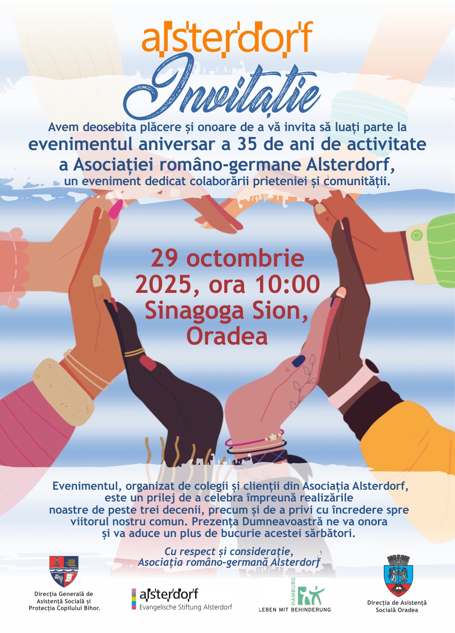 Pentru a marca această călătorie de 35 de ani, Asociația româno-germană Alsterdorf va organiza evenimentul aniversar „35 de ani de activitate în România a Proiectului Rumänienhilfe Alsterdorf”, care va avea loc miercuri, 29 octombrie 2025, ora 10:00, la Sinagoga Neologă Sion din Oradea. Evenimentul va fi moderat de Adriana Vidican și Dorin Chișe, iar mesajul de bun venit va fi transmis de Emil Cuc, managerul Asociației Alsterdorf.