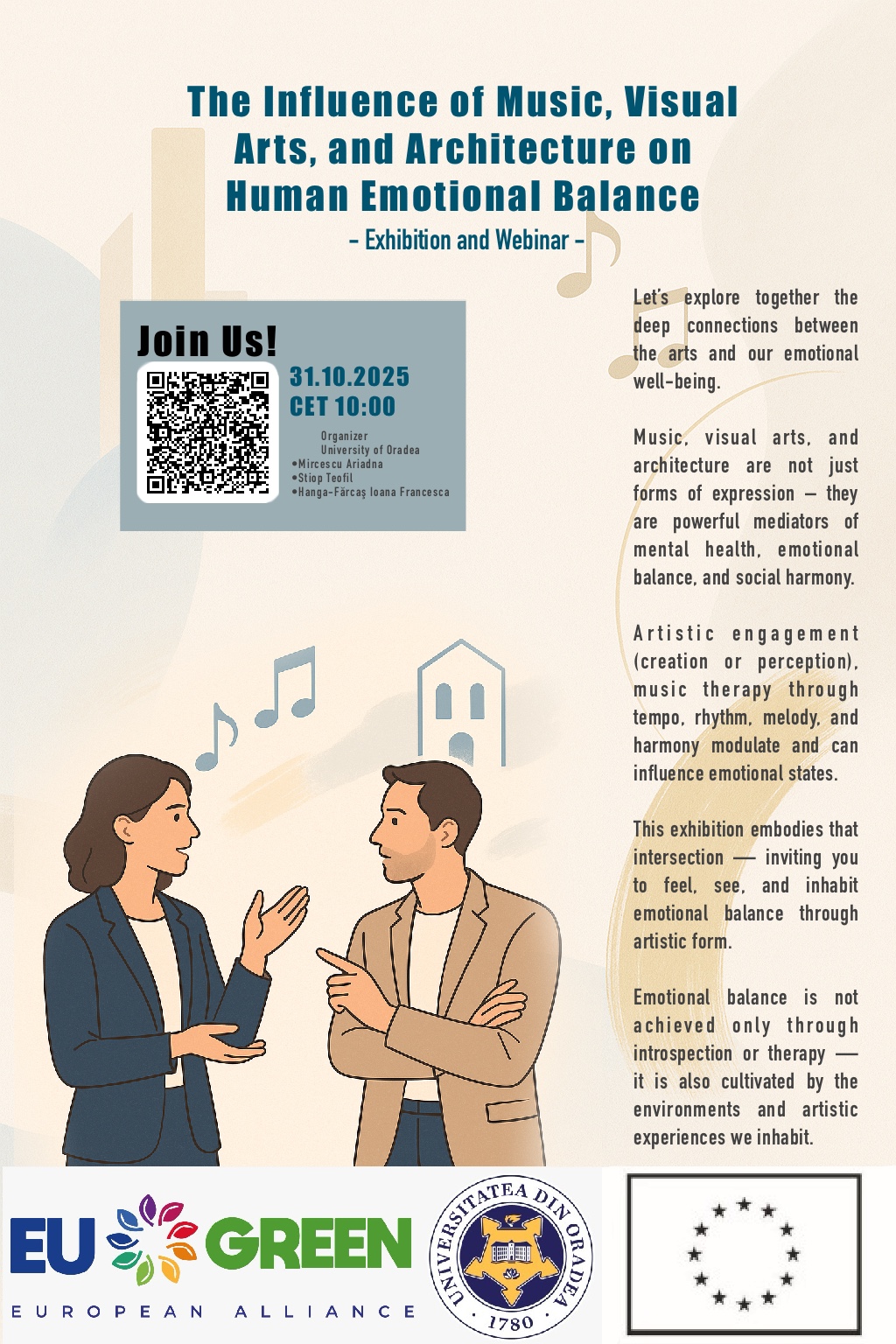 Universitatea din Oradea organizează vineri, 31 octombrie 2025, de la ora 11:00, la Biblioteca Universității, evenimentul „Cum influențează arta stările noastre emoționale și echilibrul interior?”, parte din seria EU GREEN – „Împreună pentru Sănătatea Mintală: 9 Tematici, 9 Universități, 9 Motive pentru Acțiune”.