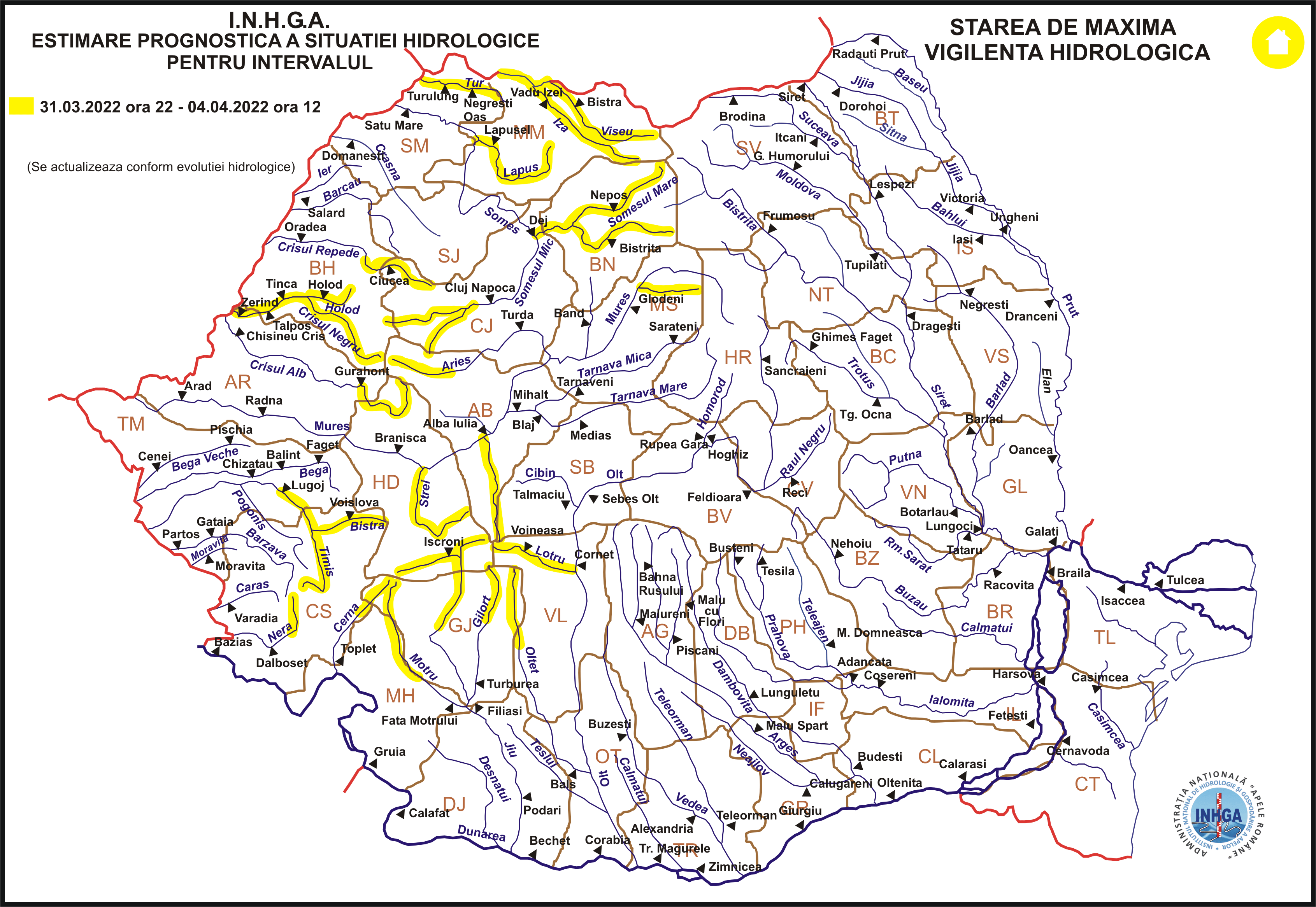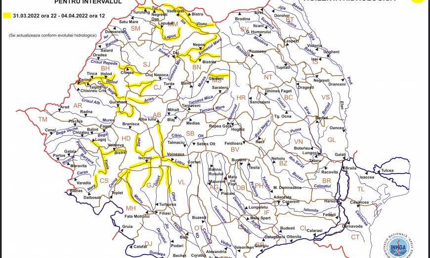 În intervalul 31.03.2022 ora 22:00 – 04.04.2022 ora 12:00 pe râurile din bazinele hidrografice: Tisa – sector aval S.H. Valea Vişeului (intrarea ȋn ţară), Vișeu, Iza, Lăpuș (judeţul Maramureș), Tur (judeţul Satu Mare), Someșul Mare (judeţul Bistrița Năsăud), Someșul Mic – bazin amonte Ac. Gilău (judeţele: Cluj și Bihor), Crişul Repede – bazin amonte S.H. Vadu Crişului (judeţele: Cluj şi Bihor), Crişul Negru (judeţele: Bihor şi Arad), Crişul Alb – bazin amonte S.H. Gurahonţ (judeţele: Hunedoara şi Arad), Mureș – afluenţii aferenți sectorului amonte S.H. Glodeni (judeţele: Harghita şi Mureş), Arieş – bazin amonte S.H. Câmpeni şi afluenţii aferenţi sectorului aval S.H. Câmpeni (judeţele: Alba şi Cluj), Mureş – afluenţii aferenţi sectorului aval S.H. Alba Iulia – amonte S.H. Săvârşin (judeţele: Alba, Hunedoara şi Arad), Timiş – bazin amonte S.H. Lugoj, Nera – bazin superior şi afluenţi bazin mijlociu şi inferior (judeţele: Caraş Severin şi Timiş), Cerna – bazin superior şi afluenţi bazin mijlociu şi inferior (judeţele: Gorj şi Caraş Severin), Jiu – bazin amonte S.H. Rovinari (judeţele: Hunedoara și Gorj), Gilort – bazin superior (judeţul Gorj), Motru – bazin amonte S.H. Broşteni şi afluenţi bazin mijlociu şi inferior (judeţele: Gorj şi Mehedinţi), Olt – afluenţii aferenți sectorului aval S.H. Cornet – amonte Ac. Ioneşti (judeţele: Vâlcea şi Argeş), Olteţ – bazin superior (judeţele: Gorj şi Vâlcea).