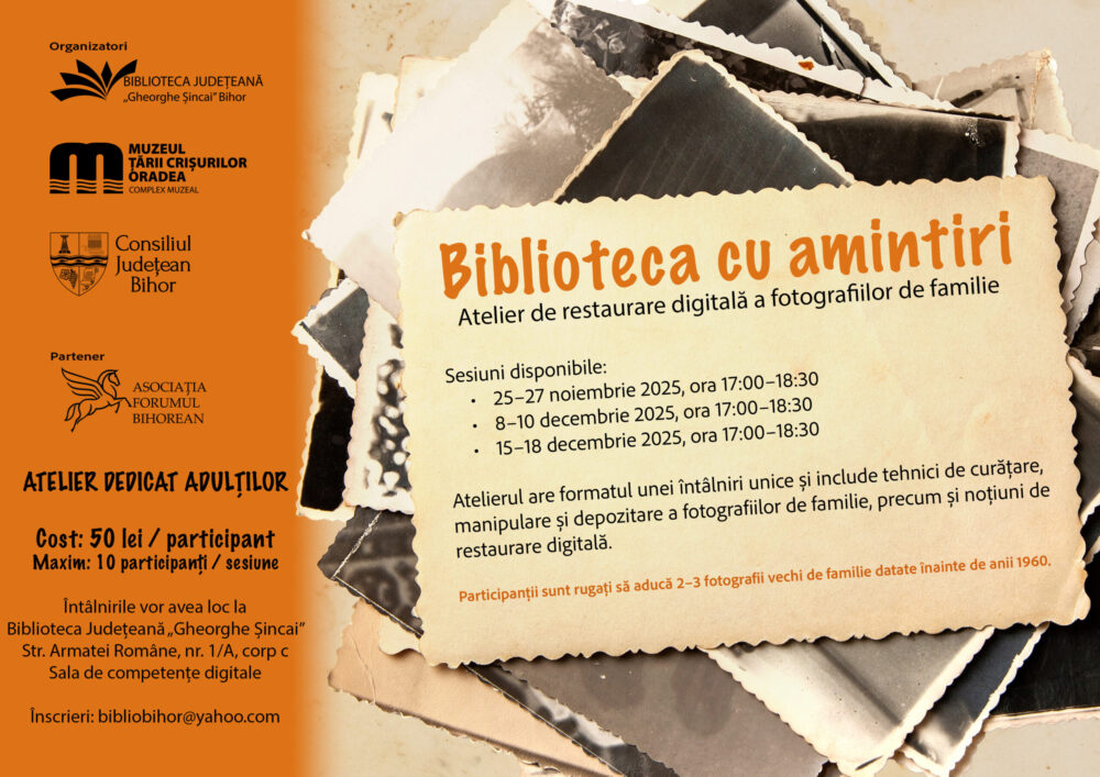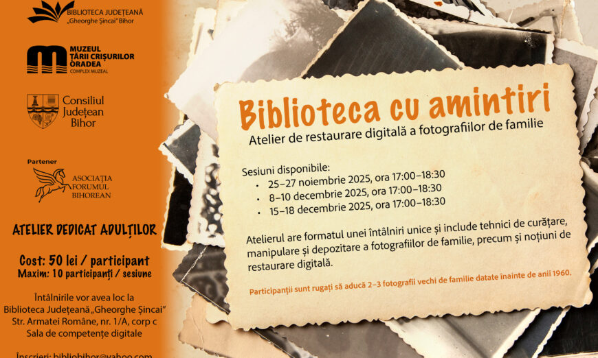 Biblioteca Județeană „Gheorghe Șincai” Bihor organizează, împreună cu Muzeul Țării Crișurilor și Consiliul Județean Bihor, și în parteneriat cu Asociația Forumul Bihorean, atelierul „Biblioteca cu amintiri”, dedicat adulților interesați de păstrarea și restaurarea fotografiilor de familie.