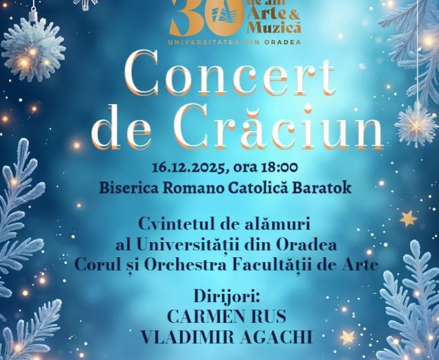Concertul de Crăciun al Departamentului de Muzică din cadrul Facultății de Arte a Universității din Oradea va avea loc în data de 16 decembrie 2025, începând de la ora 18:00, la Biserica Romano-Catolică „Baratok”, de pe strada Dunărea.