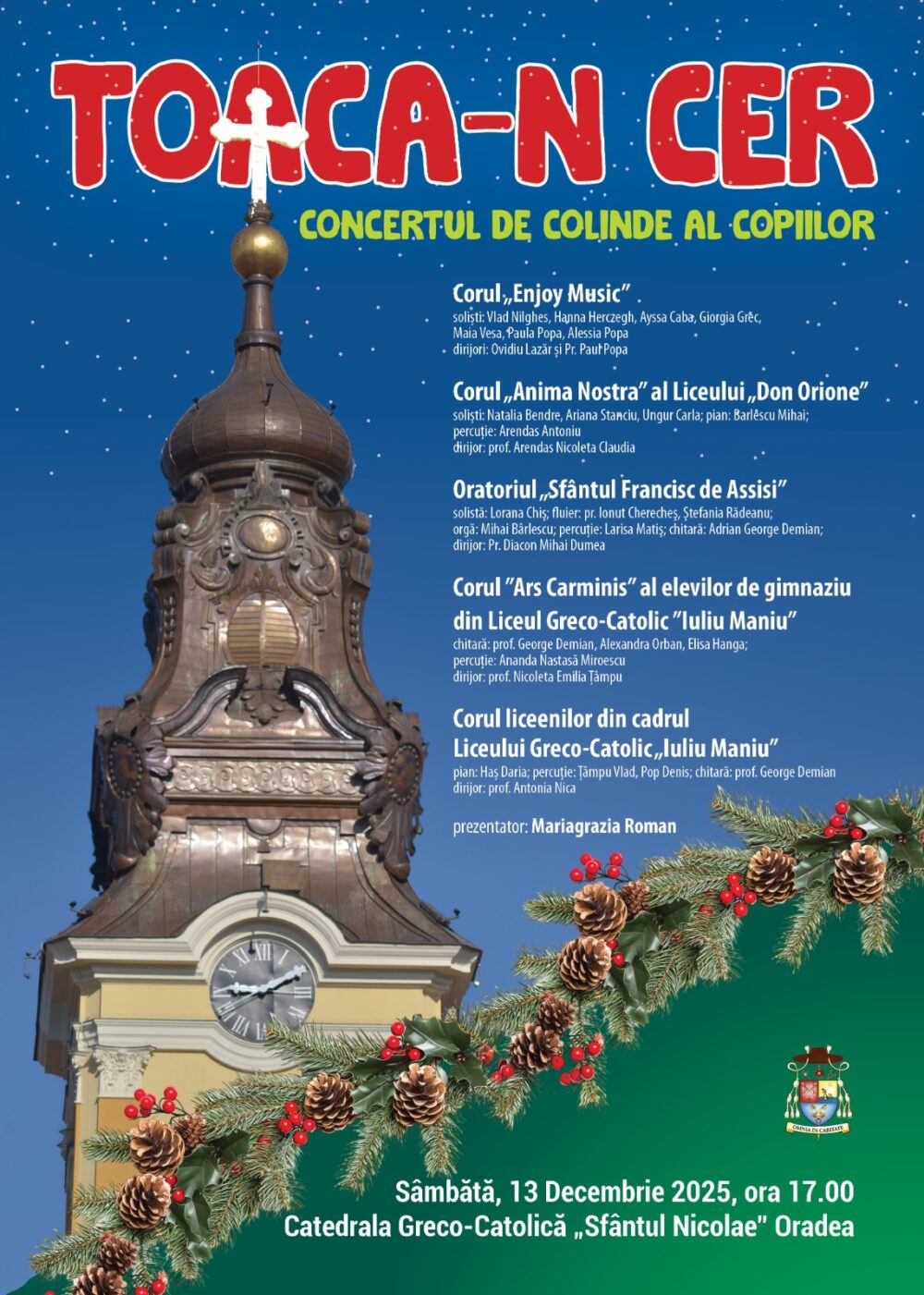 Episcopia Greco-Catolică de Oradea organizează sâmbătă, 13 decembrie 2025, de la ora 17:00, în Catedrala „Sfântul Nicolae”, concertul de colinde al copiilor „Toaca-n cer”. Evenimentul reunește coruri și grupuri de tineri din școli și comunitate, pregătite să aducă bucuria Nașterii Domnului în Anul Sfânt al speranței.