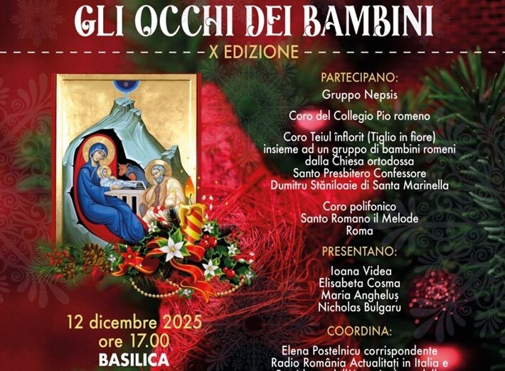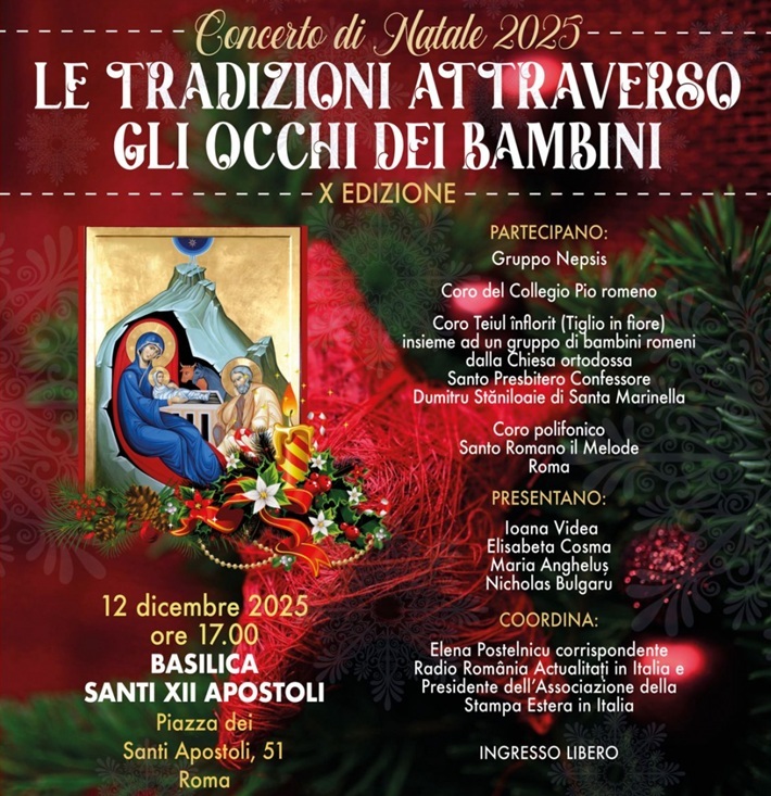 A zecea ediţie a concertului de colinde româneşti „Tradiţii prin ochi de copii” va avea loc vineri, de la ora 17.00, în Bazilica Sfinţii XII Apostoli din Roma, anunţă Accademia di Romania. Evenimentul, devenit tradiție pentru comunitatea românească din capitala Italiei, este organizat de Asociaţia „Insieme per Athos”, Episcopia Ortodoxă Română din Italia, Accademia di Romania din Roma şi Radio România, sub patronajul ambasadelor României în Italia, pe lângă Sfântul Scaun și al Republicii Moldova.