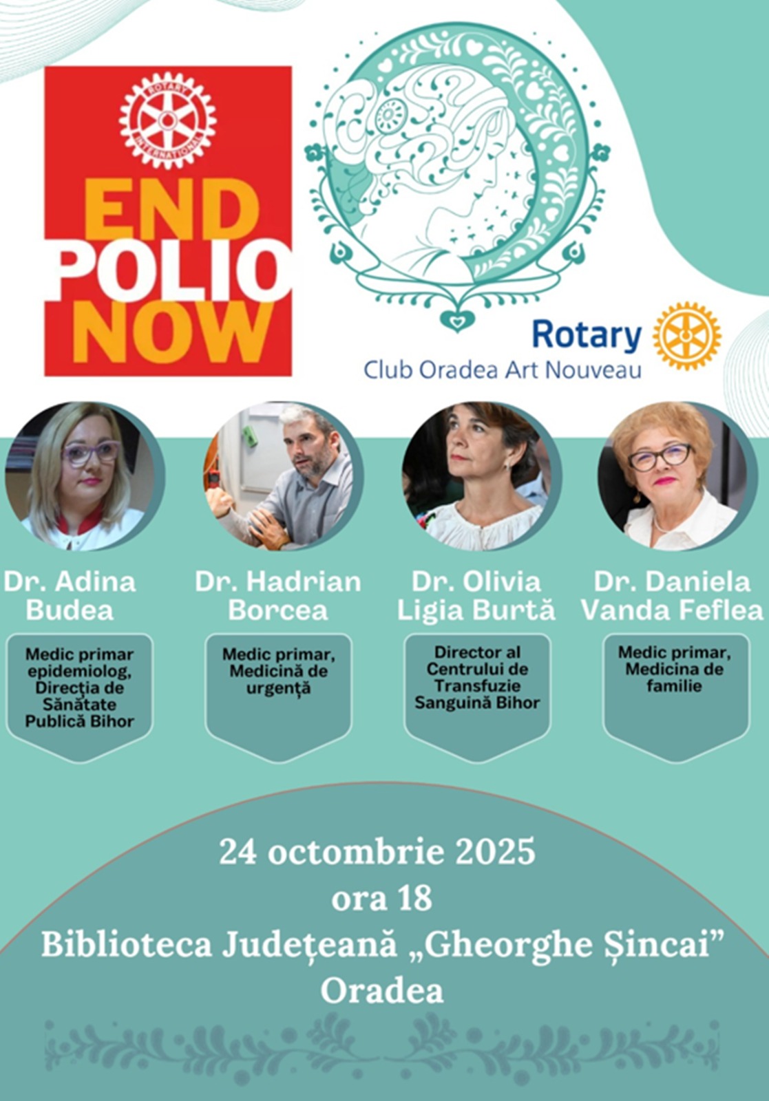 Puteţi participa la ConferinţaEndPolioNow, organizată de Rotary Club Oradea ArtNouveau din data de 24 0ctombrie 2025 de la ora 18 accesând linkul: