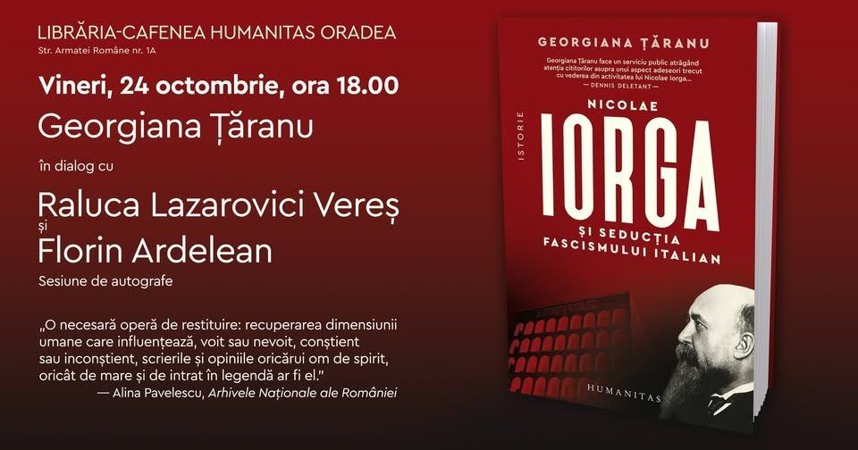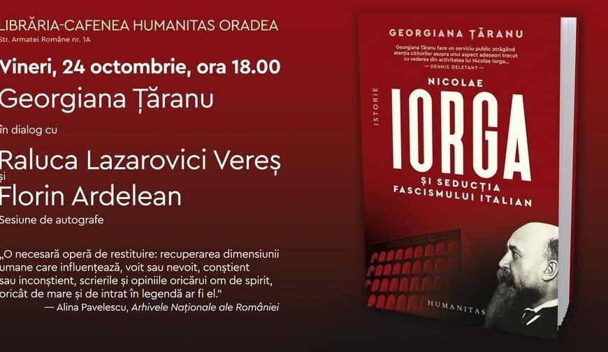 După un amplu periplu în toată țara, vineri, 24 octombrie 2025, de la ora 18.00, se va lansa și la Oradea volumul „Nicolae Iorga și seducția fascismului italian” (Humanitas, 2025), a istoricului Georgiana Țăranu, profesor la Universitatea „Ovidius” din Constanța. Cartea are la bază lucrarea de doctorat a autoarei obținut la Institutul de istorie Nicolae Iorga din capitală, fiind resultatul a 10 ani de efort de cercetare în arhivele românești și italiene, inclusiv cele ale Vaticanului.