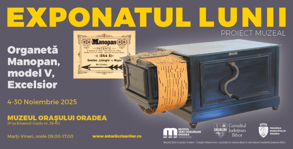 Exponatul lunii noiembrie este un aparat muzical, Organetă Manopan, model V, Excelsior, clasat în categoria Tezaurși care va putea fi admirat la Muzeul Orașului Oradea (P-ța Emanuil Gojdu nr. 39-41), Sala cu grifoni, începând cu data de 4 noiembrie a.c., în intervalul orar 09.00-17.00.