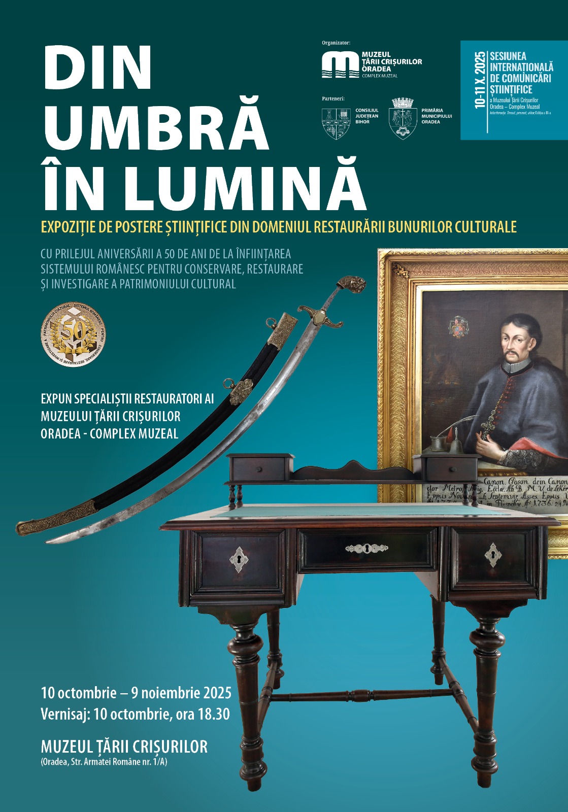 Muzeul Țării Crișurilor Oradea – Complex Muzeal organizează, în parteneriat cu Consiliul Județean Bihor și Primăria Municipiului Oradea, expoziția Din umbră în lumină. Acest eveniment face parte din seria de activități organizate cu prilejul celei de-a treia ediții a Sesiunii internaționale de comunicări științifice a Muzeului Țării Crișurilor Oradea – Complex Muzeal, Interferențe. Trecut, prezent, viitor, și marchează aniversarea a 50 de ani de la înființarea sistemului românesc pentru conservare, restaurare și investigare a patrimoniului cultural.