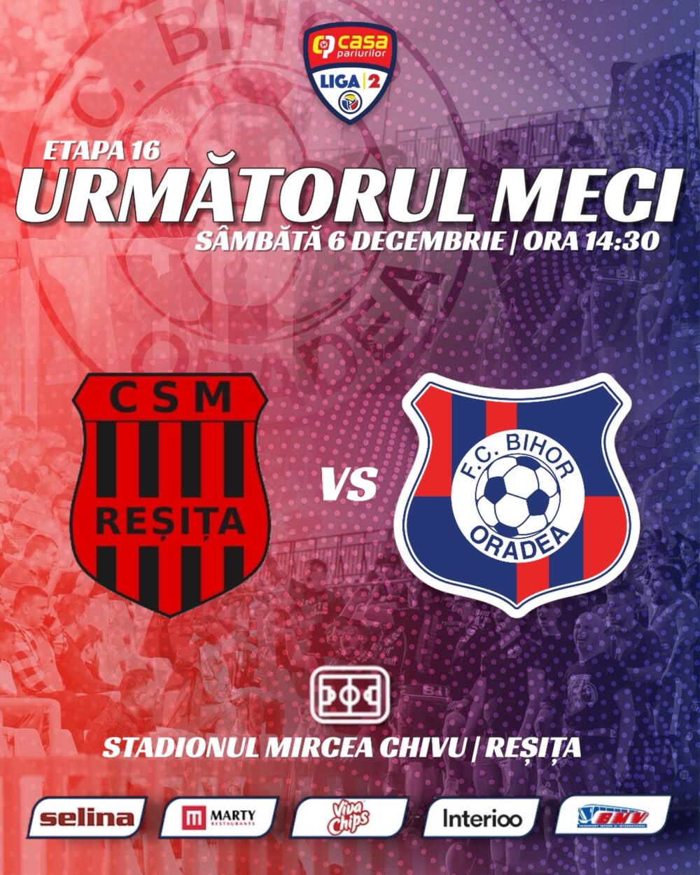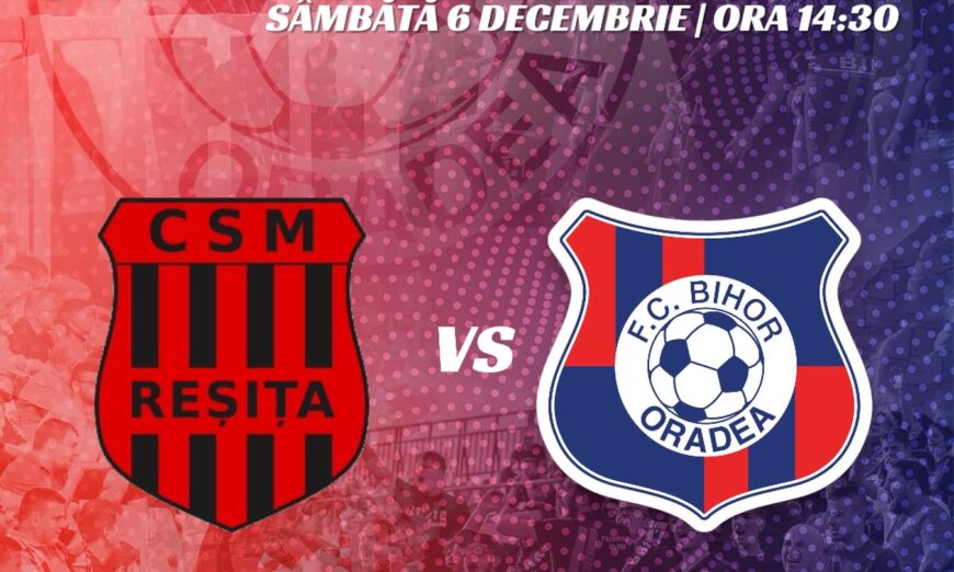 FC Bihor dispută în acest weekend ultimul meci în deplasare din acest an, pe terenul celor de la CSM Reșița, sâmbătă, 6 decembrie, de la ora 14:30, pe Stadionul Mircea Chivu. Confruntarea aduce față în față două formații aflate umăr la umăr în clasament: FC Bihor ocupă locul 5, iar CSM Reșița poziția a 6-a, ambele având câte 29 de puncte după 9 victorii, 2 remize și 4 înfrângeri în cele 15 etape disputate.