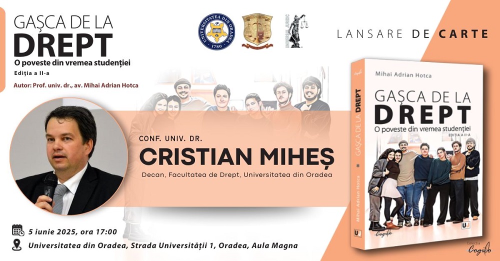 Facultatea de Drept a Universității din Oradea, în parteneriat cu Grupul editorial Universul Juridic, organizează joi, 5 iunie 2025, ora 17.00, în Aula Magna a instituției, evenimentul de lansare a ediției a II-a a volumului „Gașca de la Drept”, semnat de prof. univ. dr. Mihai Adrian Hotca, avocat penalist și rector al Universității „Nicolae Titulescu” din București.