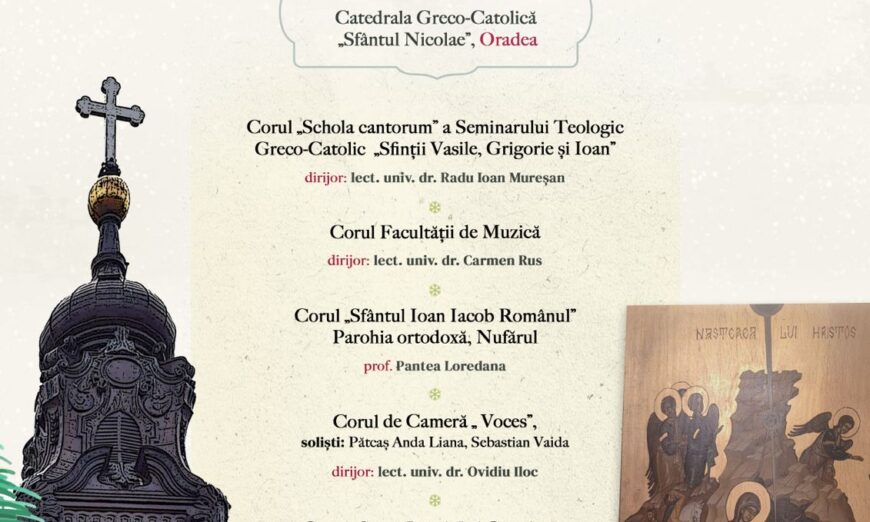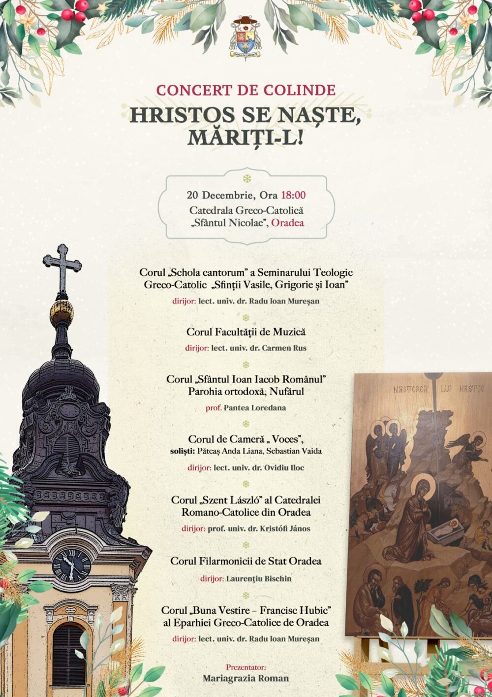 Episcopia Română Unită cu Roma, Greco-Catolică din Oradea invită publicul la concertul de colinde „Hristos se naște, măriți-L”, care va avea loc vineri, 20 decembrie, de la ora 18:00, în Catedrala Greco-Catolică „Sfântul Nicolae” din Oradea. Intrarea este liberă.