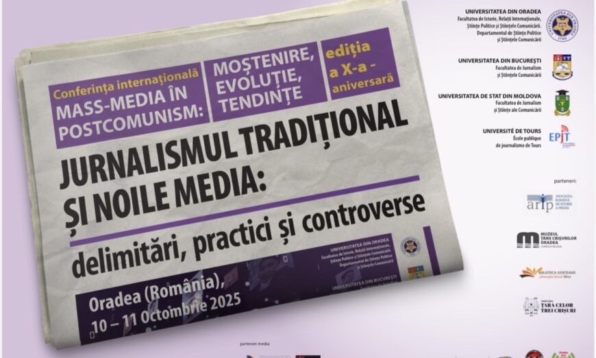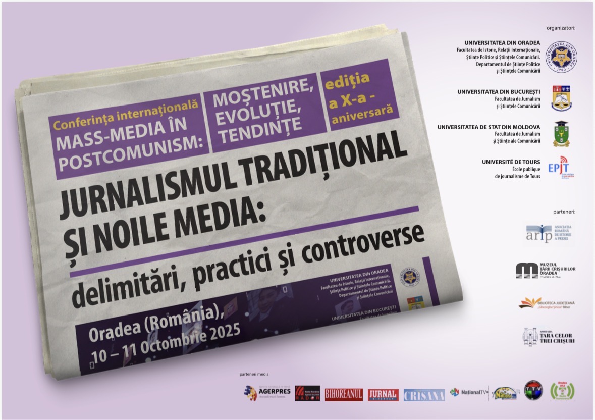 Vineri și sâmbătă, 10 – 11 octombrie, Departamentul de Științe Politice și Științele Comunicării din cadrul Facultății de Istorie, Relații Internaționale, Științe politice și Științele Comunicării propune reuniunea academică având titlul: Jurnalismul tradițional și noile media: delimitări, practici și controverse. Este cea de-a zecea Conferință Mass-media în postcomunism: moștenire, evoluție, tendințe (prima a avut loc în anul 2016), aniversând astfel un deceniu de analize și dezbateri cu privire la evoluția mass-media după decembrie 1989, fiind aduse în prim-plan virtuțile și responsabilitățile jurnalismului scos de sub interdicțiile cenzurii, conjuncțiile acestuia cu politica, istoria sau literatura, precum și crizele de „creștere” consemnate în intervalul a 35 de ani. Anul acesta vor fi protagoniștii discuțiilor, prezentând lucrări, peste 60 de specialiști în comunicare, jurnaliști și universitari din țară (București, Timișoara, Cluj-Napoca, Iași, Arad, Bacău și Oradea), precum și din Franța, Irlanda de Nord, Republica Moldova și Ungaria.