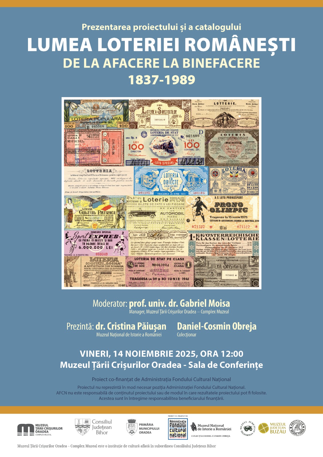 Muzeul Țării Crișurilor Oradea – Complex Muzeal găzduiește vineri, 14 noiembrie 2025, de la ora 12:00, prezentarea proiectului și a catalogului „Lumea loteriei românești. De la afacere la binefacere 1837–1989”, un demers cultural realizat în colaborare cu Muzeul Național de Istorie a României și alte instituții muzeale din țară. Evenimentul se va desfășura în Sala de conferințe a muzeului (Str. Armatei Române nr. 1/A), cu sprijinul Consiliului Județean Bihor și al Primăriei Oradea.