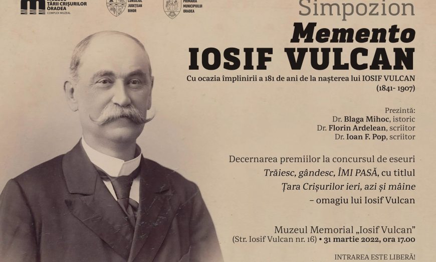 În data de 31 martie a.c. se împlinesc 181 de ani de la nașterea lui Iosif Vulcan (1841- 1907), prilej cu care Muzeul Țării Crișurilor Oradea – Complex Muzeal, în parteneriat cu Consiliul Județean Bihor și Primăria Municipiului Oradea, organizează un simpozion dedicat cărturarului bihorean, intitulat Memento Iosif Vulcan, care va avea loc joi, 31 martie a.c., ora 17.00, la sediul Muzeului Memorial „Iosif Vulcan”.