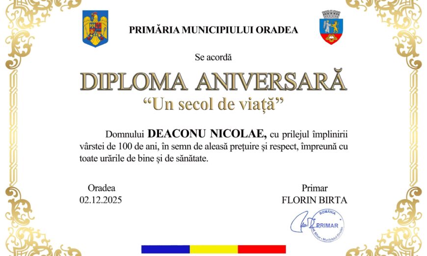 Primăria Municipiului Oradea aduce un omagiu longevității și contribuției la comunitate, acordând un premiu aniversar domnului Deaconu Nicolae, care a împlinit venerabila vârstă de 100 de ani în data de 27 noiembrie.