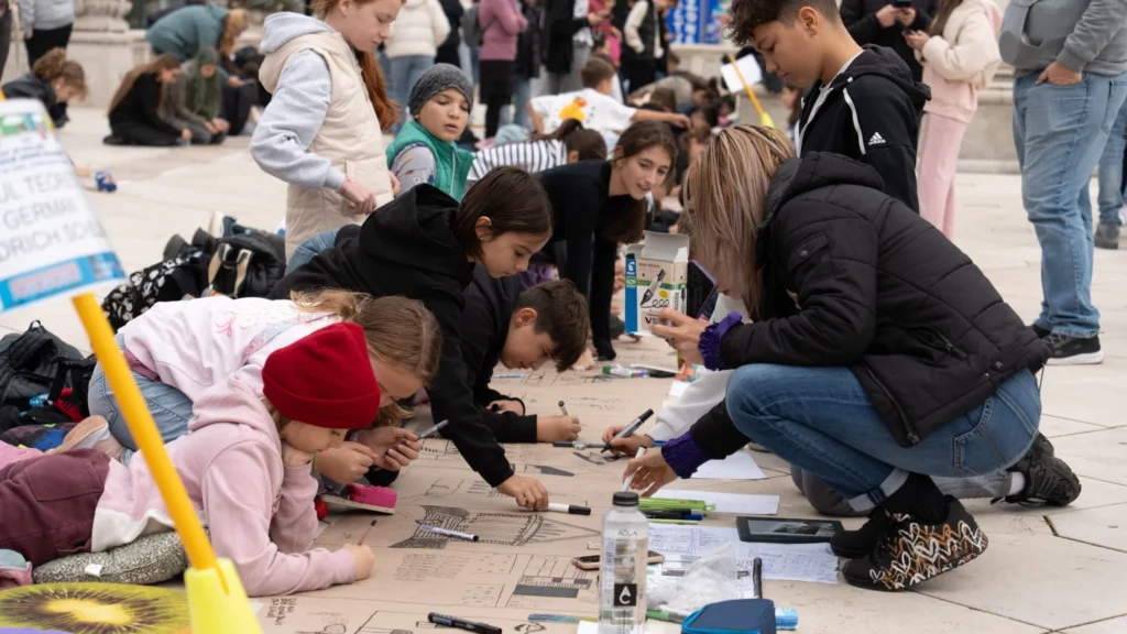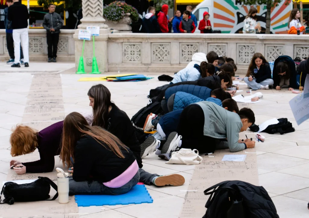 Aproape 600 de copii s-au adunat în Piața Unirii și în jurul Catedralei Sfântul Nicolae, uniți de un scop comun: realizarea celei mai lungi benzi desenate din România.