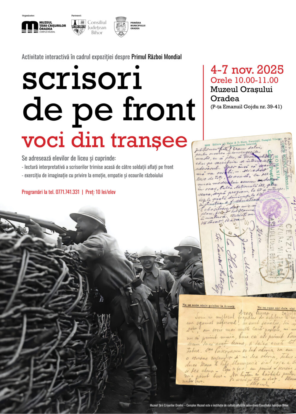 Muzeul Țării Crișurilor Oradea – Complex Muzeal organizează, în parteneriat cu Consiliul Județean Bihor și Primăria Municipiului Oradea, atelierul de educație muzeală Scrisori de pe front. Voci din tranșee.Acesta este destinat elevilor de liceu și va avea loc în perioada 4-7 noiembrie 2025, orele 10.00, la Muzeul Orașului Oradea (P-ța Emanuil Gojdu nr. 39-41).
