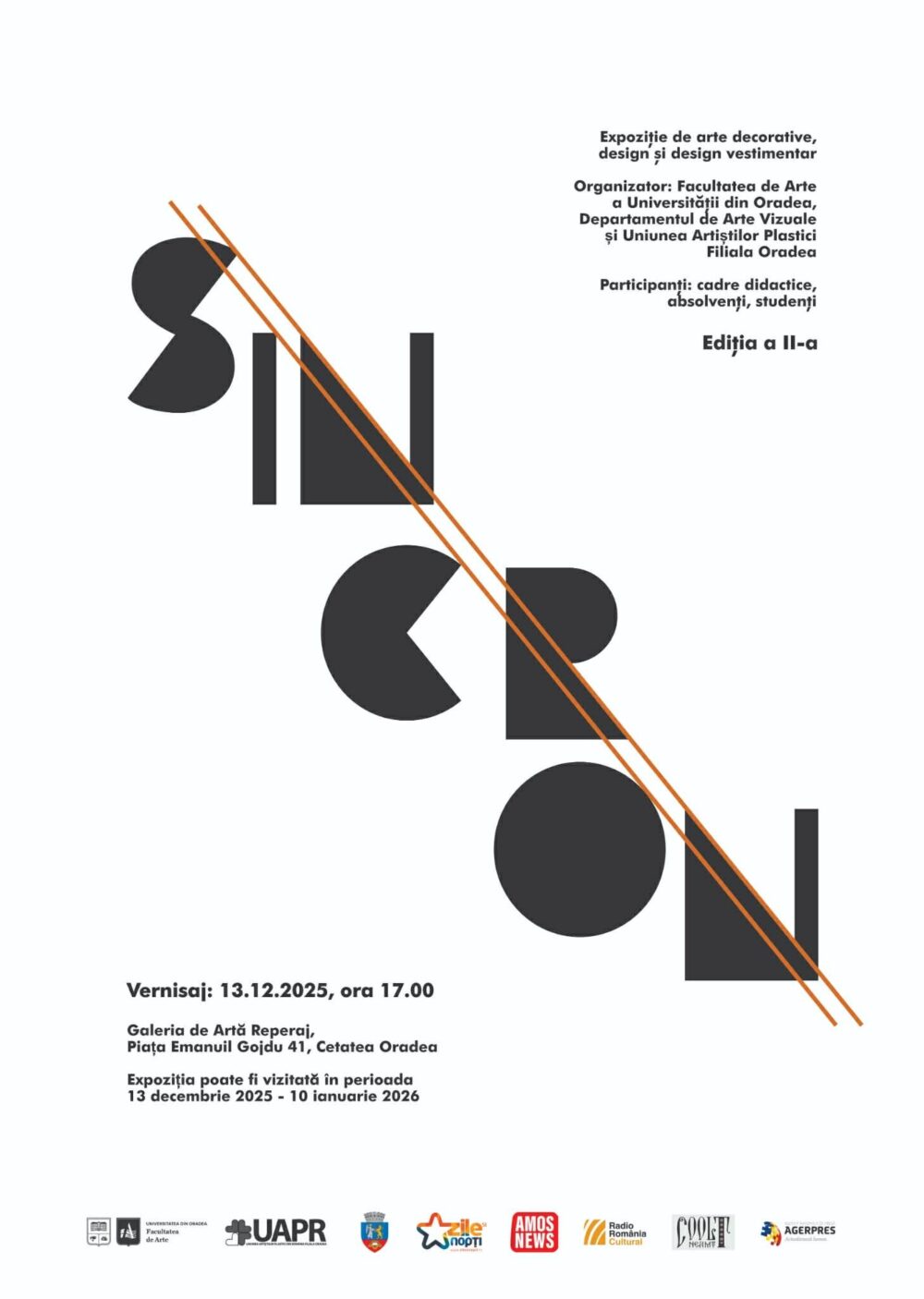 Departamentul de Arte Vizuale al Facultății de Arte Oradea, în parteneriat cu UAP – filiala Oradea, organizează a doua ediție a expoziției „Sincron”. Vernisajul va avea loc sâmbătă, 13 decembrie, de la ora 17, la Galeriile „Reperaj” din Cetatea Oradea.