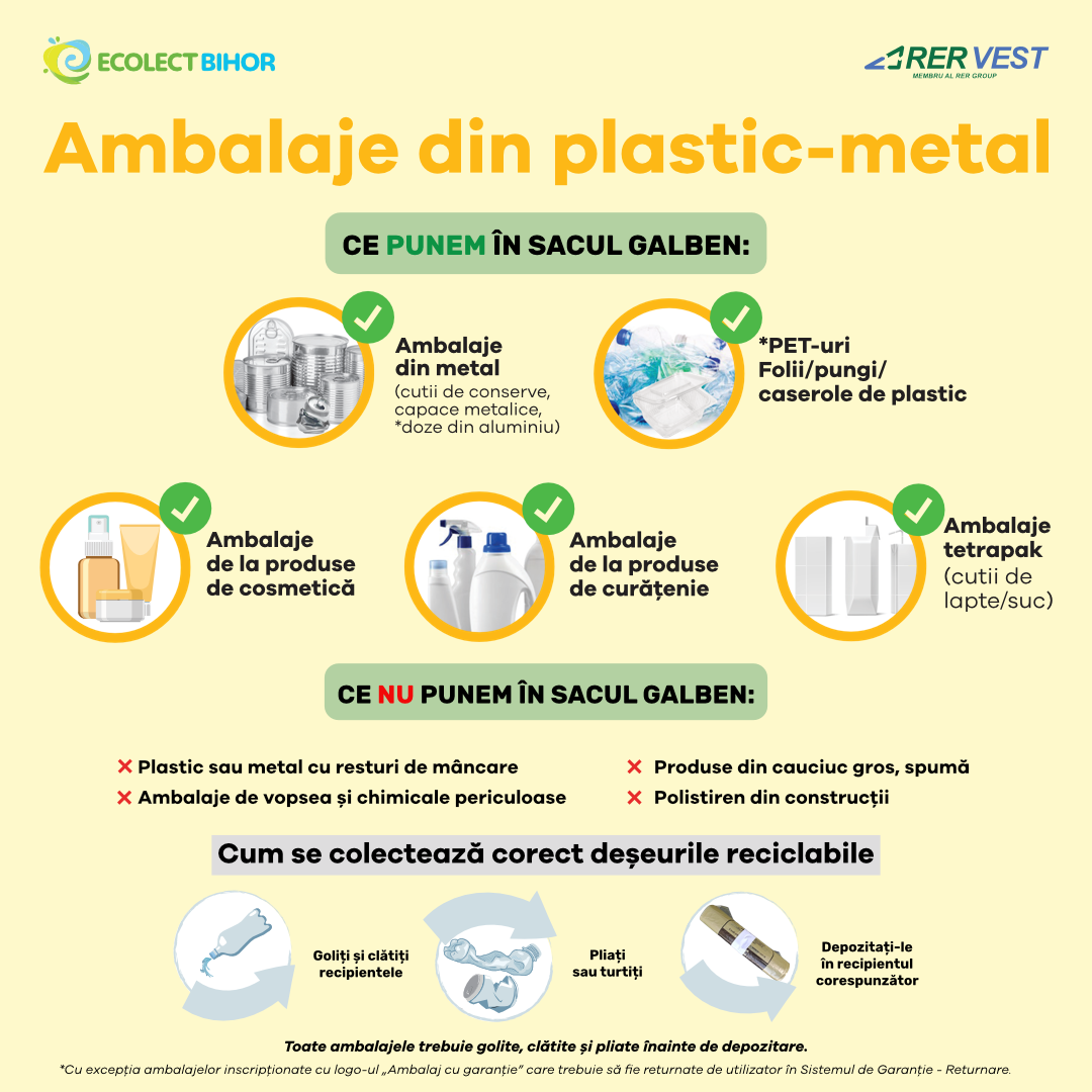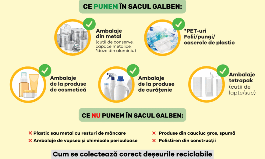 Rolele de saci se pot ridica gratuit, în limita a două role/gospodărie – una cu 25 de saci galbeni pentru depozitarea ambalajelor din plastic și metal și una cu 14 saci albaștri pentru depozitarea deșeurilor din hârtie și carton.