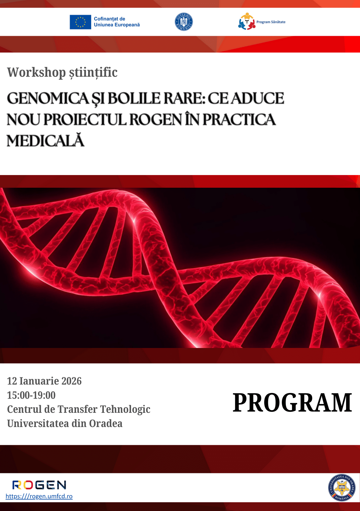 Universitatea din Oradea, partener în proiectul științific ROGEN, organizează primul workshop științific dedicat medicinei genomice, un eveniment care își propune să deschidă noi perspective asupra aplicării genomicii în practica medicală curentă. Atelierul, intitulat „Genomica și bolile rare – Ce aduce nou proiectul ROGEN în practica medicală”, va avea loc pe 12 ianuarie 2026, între orele 15:00 și 19:00, în cadrul Centrului de Transfer Tehnologic al Universității din Oradea.
